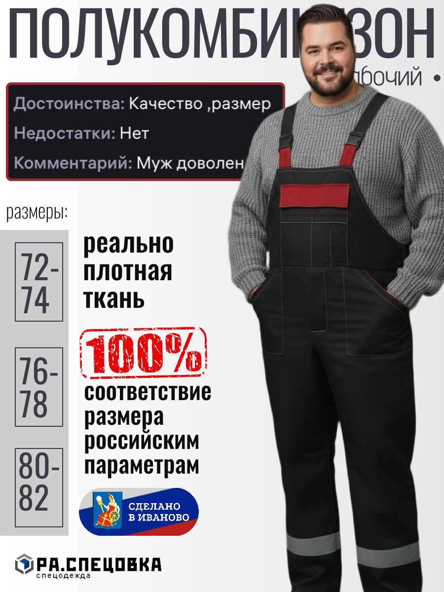 Мужская спецовка доступна в больших размерах (60-68), что позволяет подобрать идеальную посадку для представителей крупной комплекции. Регулируемые лямки обеспечивают комфорт и свободу движений, а усиленные швы гарантируют долговечность.