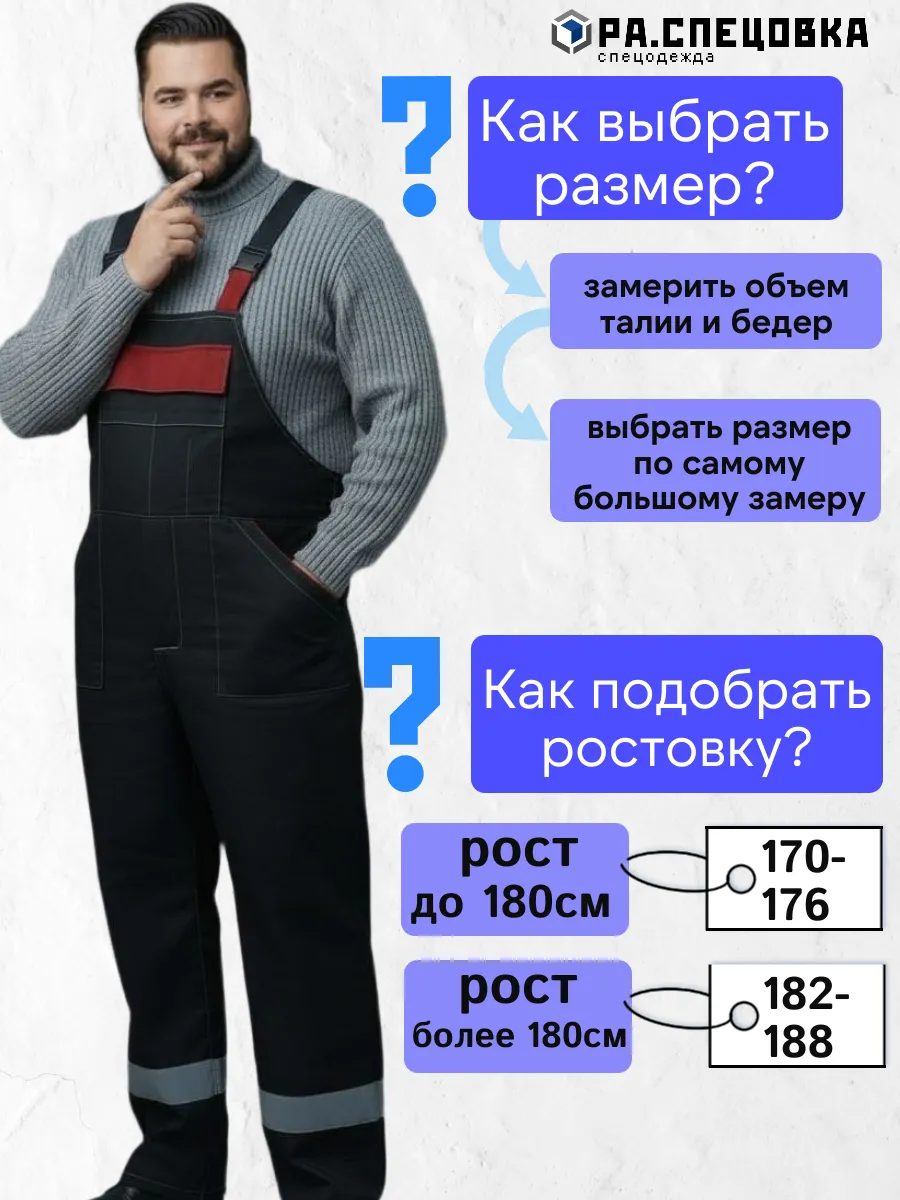 Мужская спецовка доступна в больших размерах (60-68), что позволяет подобрать идеальную посадку для представителей крупной комплекции. Регулируемые лямки обеспечивают комфорт и свободу движений, а усиленные швы гарантируют долговечность.