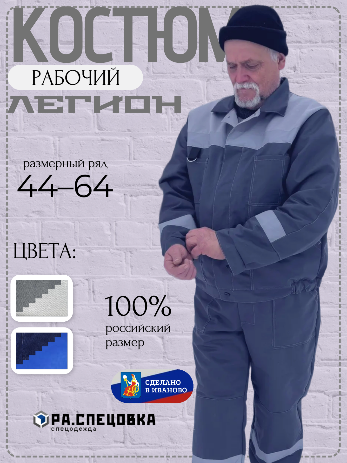 Костюм рабочий является комплектом и состоит из двух предметов одежды: укороченная куртка с поясом и полукомбинезон с регулируемыми лямками. Укороченная куртка костюма Легион имеет свои конструктивные особенности, что обеспечивает ее удобство, комфорт в эксплуатации и безопасность: - специальная светоотражающая полоса (СОП) 5 см на передней половине и спинке; - супатная застежка и широкие манжеты на пуговицах; - два нагрудных кармана. прошитых двойной строчкой для надежности и с отделением для ручки; - два больших, удобных и глубоких нижних кармана; - специальные усилительные накладки в области локтевого сгиба. Полукомбинезон костюма Легион - это удобная альтернатива брюкам, особенно для тех. чья работа требует использования дополнительных инструментов (маляр, шиномонтажник. строитель, отделочник, слесарь, плотник, столяр, электрик, сантехник).