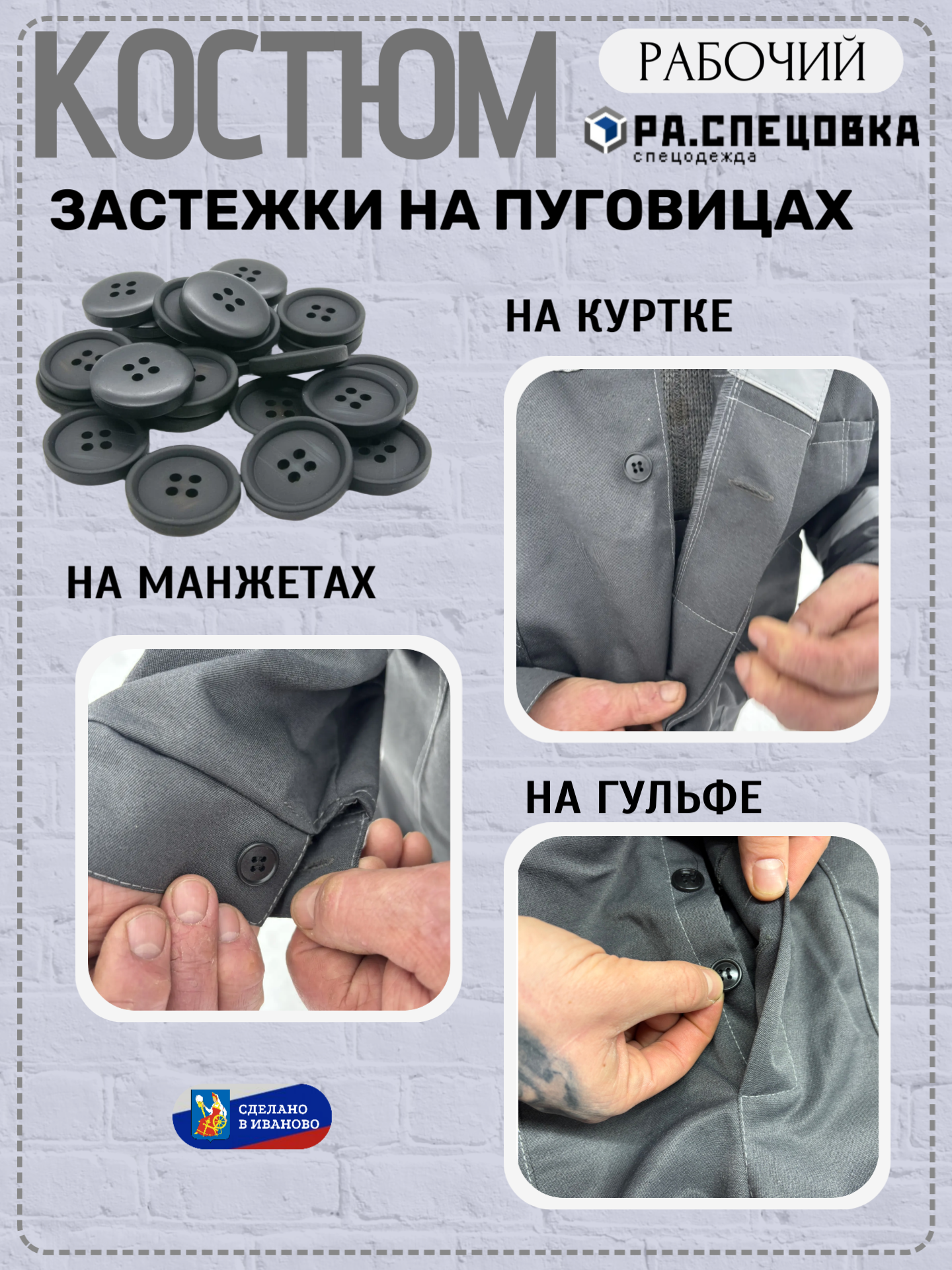 Костюм рабочий является комплектом и состоит из двух предметов одежды: укороченная куртка с поясом и полукомбинезон с регулируемыми лямками. Укороченная куртка костюма Легион имеет свои конструктивные особенности, что обеспечивает ее удобство, комфорт в эксплуатации и безопасность: - специальная светоотражающая полоса (СОП) 5 см на передней половине и спинке; - супатная застежка и широкие манжеты на пуговицах; - два нагрудных кармана. прошитых двойной строчкой для надежности и с отделением для ручки; - два больших, удобных и глубоких нижних кармана; - специальные усилительные накладки в области локтевого сгиба. Полукомбинезон костюма Легион - это удобная альтернатива брюкам, особенно для тех. чья работа требует использования дополнительных инструментов (маляр, шиномонтажник. строитель, отделочник, слесарь, плотник, столяр, электрик, сантехник). А также: - отрезная грудка с большим карманом с клапаном; - регулируемые бретели на застежках-карабинах; - центральная застежка-гульфик на 3 пуговицах; - в области талии удобная боковая застежка: - резинка в области талии для комфортной посадки. Назначение: универсальная спецодежда, для слесарных работ, для производств и заводов, мужская спецодежда рабочая Ткань: смесовая (80% полиэстер/ 20% хлопок) Плотность: 200 г/м2