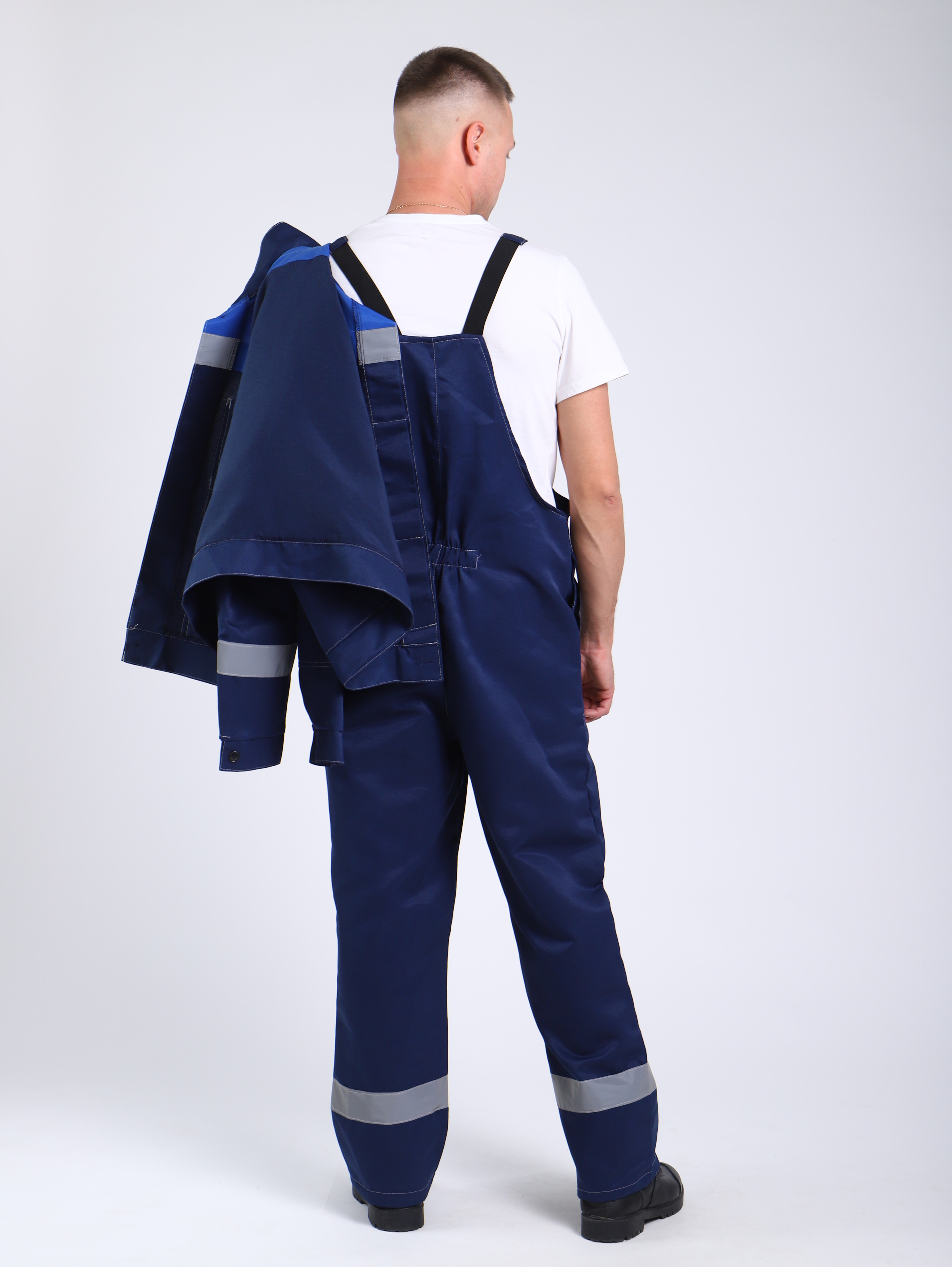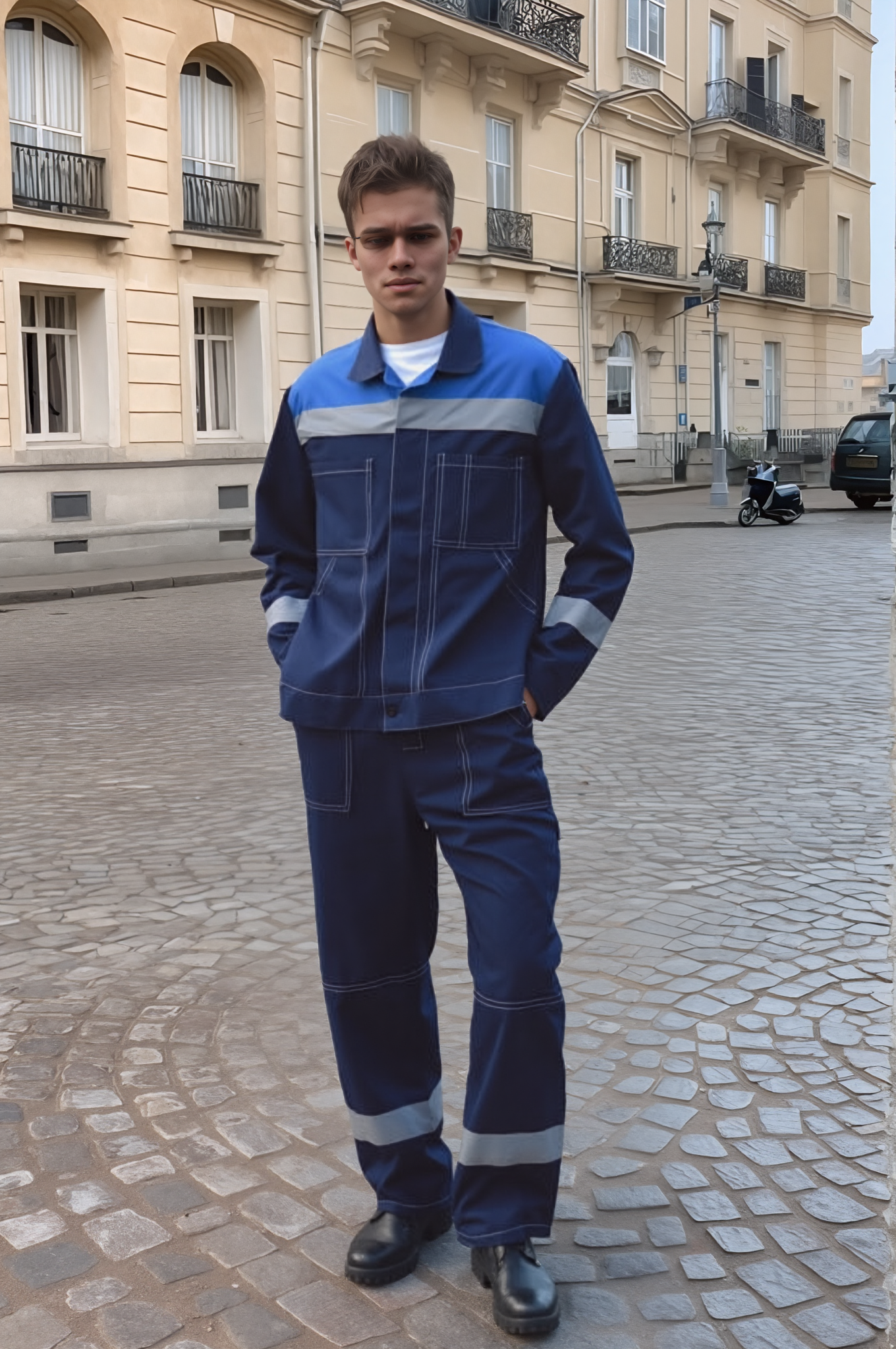 Костюм рабочий является комплектом и состоит из двух предметов одежды: укороченная куртка с поясом и полукомбинезон с регулируемыми лямками.