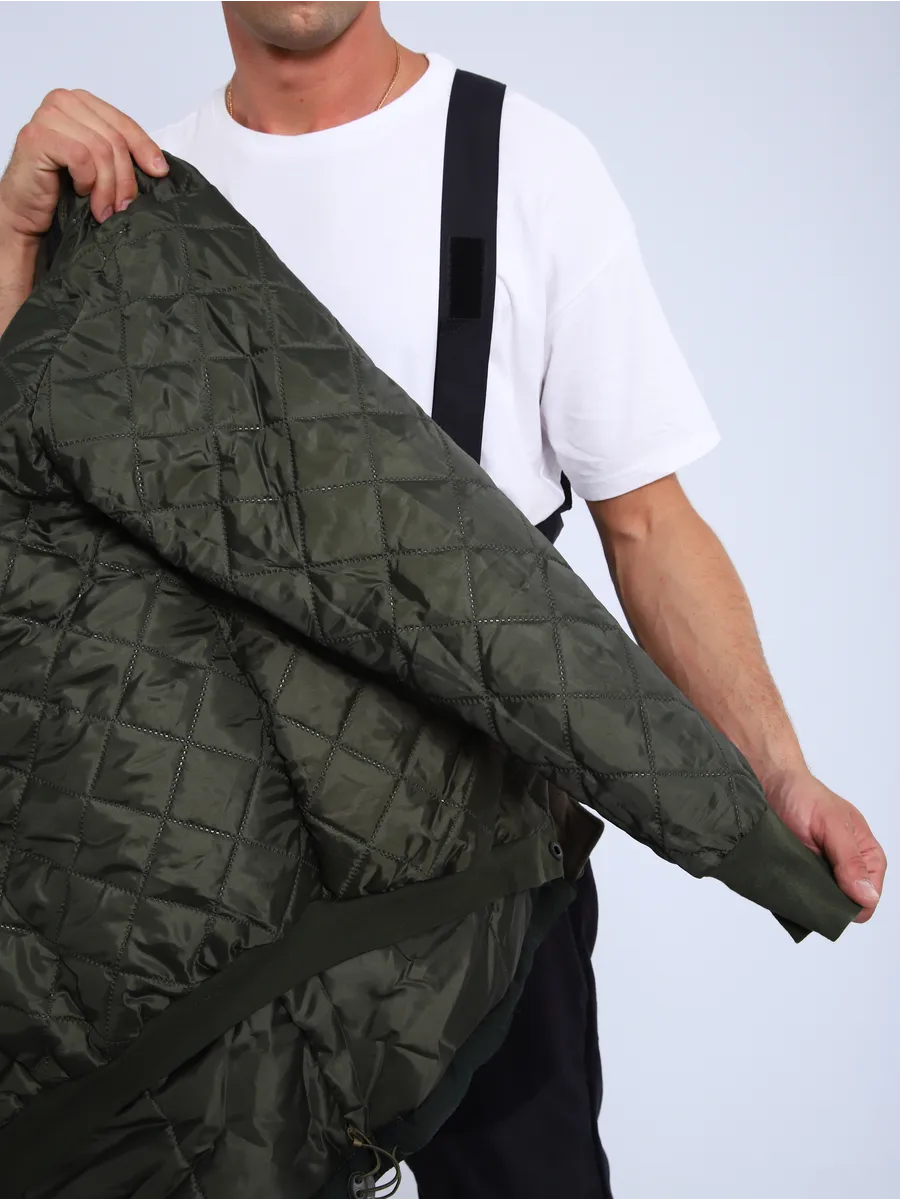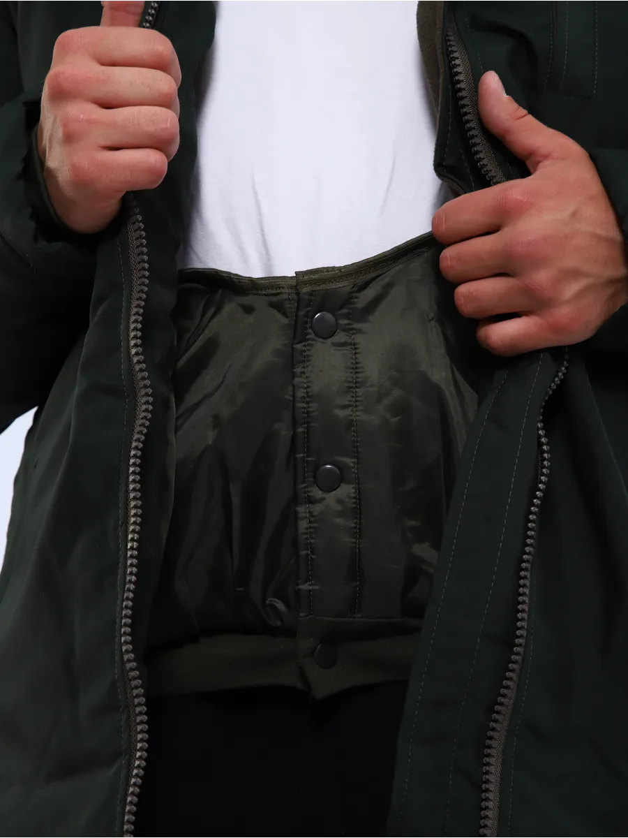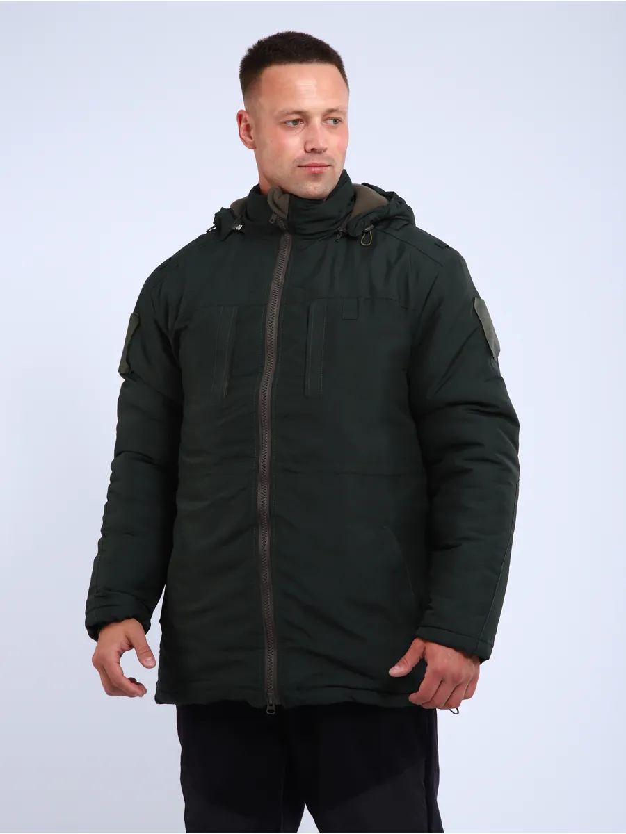 Бушлат прямого кроя,состоящий из куртки верхней, съемной утепленной куртки и капюшона. Застегивается на молнию. Оснащена отстегивающимся капюшоном с эластичным шнуром для регулировки по объему. Область талии также затягивается на шнур при необходимости. Плечевые швы имеют шлевки для крепления погон. Модель оснащена карманами: два нижних прорезных, два нагрудных на молнии, один потайной. На рукавах нашиты липучки для крепления шевронов.